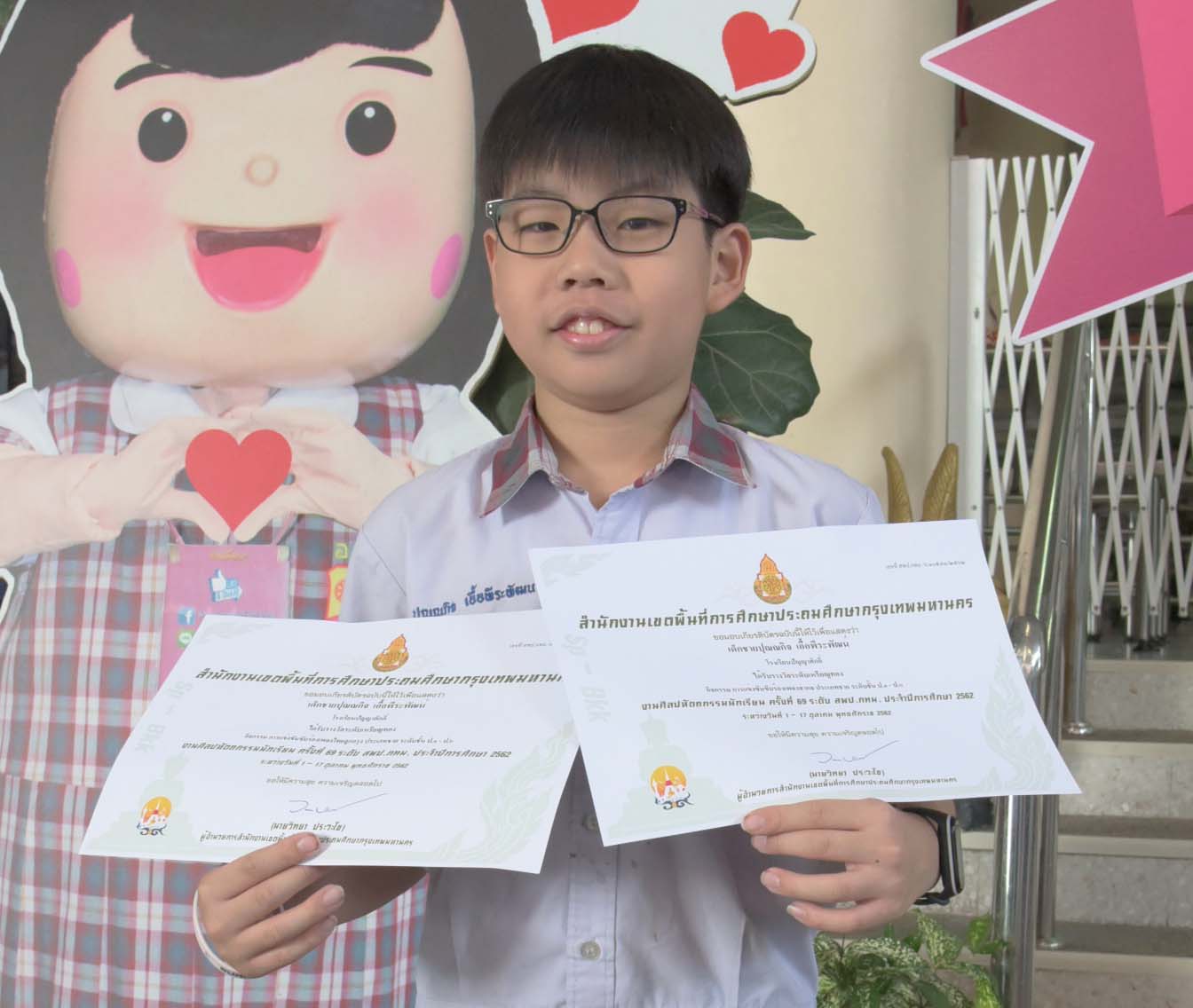 ได้รับรางวัลผ่านเกณฑ์ (รอบที่ 1) จากการแข่งขันสอบเข้าโครงการพัฒนาอัจฉริยะภาพทางวิทยาศาสตร์และคณิตศาสตร์ (คณิตศาสตร์ ป.3) จัดแข่งขันโดย สถาบันส่งเสริมการสอนวิทยาศาสตร์ ฃและเทคโนโลยี กระทรวงศึกษา เมื่อวันที่ 17 ธันวาคม 2562