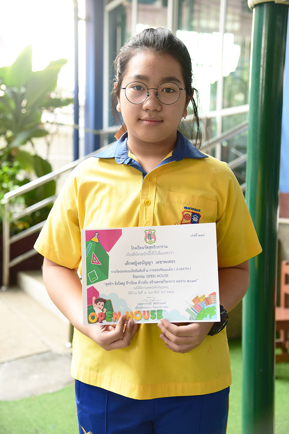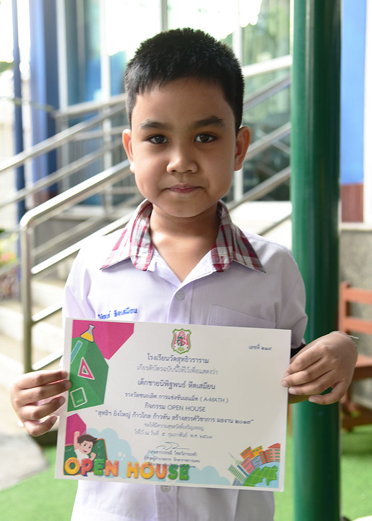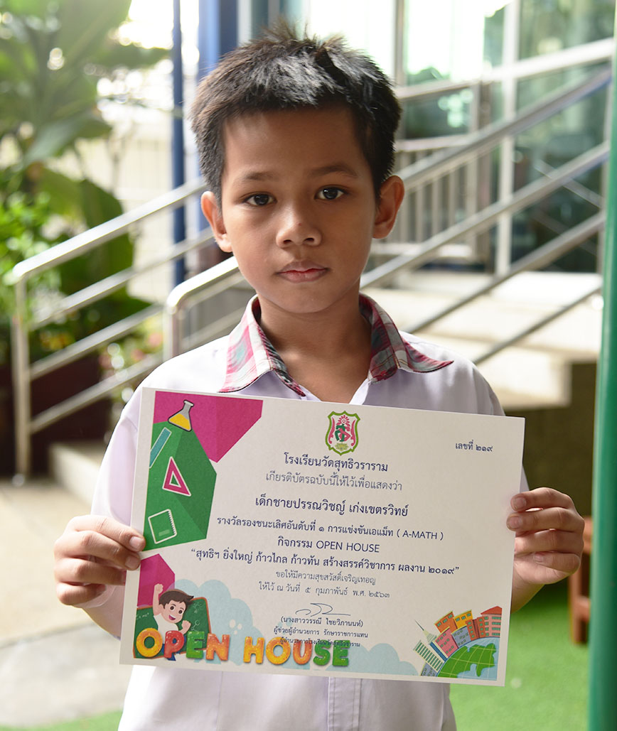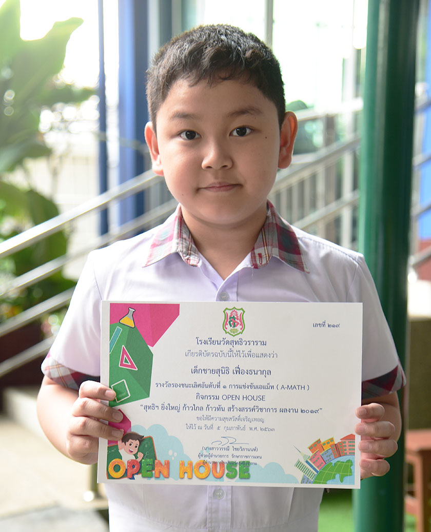ได้รับรางวัลรองชนะเลิศ อันดับ 1 ในการสอบแข่งขัน Amath การต่อเลขคำนวณ รุ่นประถมศึกษา ในงาน OPEN HOUSE ณ โรงเรียนวัดสุทธิวราราม เมื่อวันที่ 5 กุมภาพันธุ์ 2563